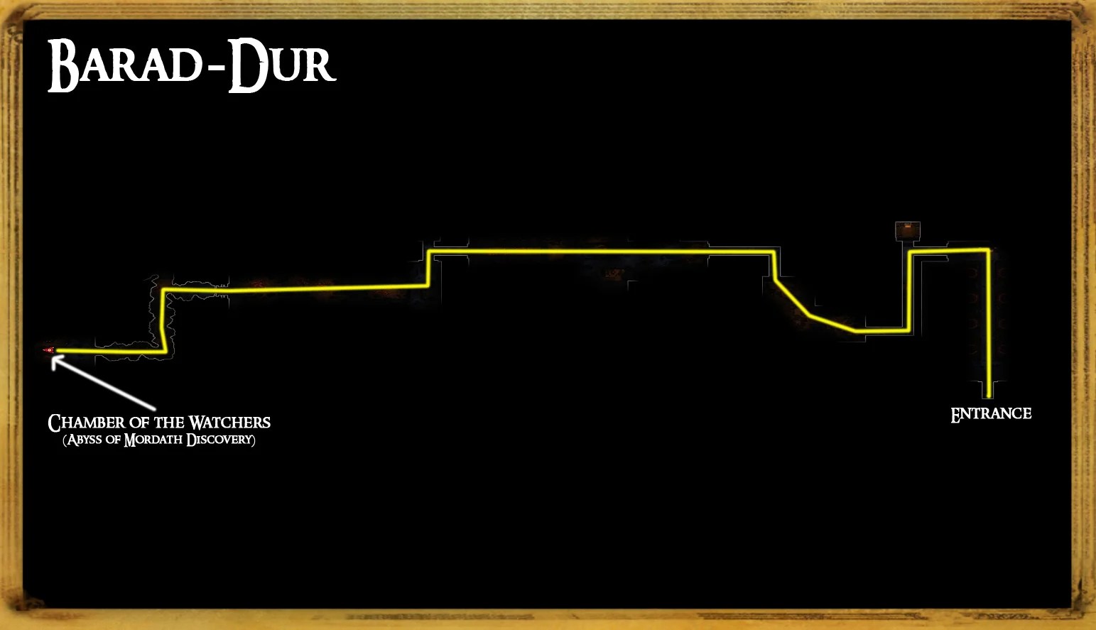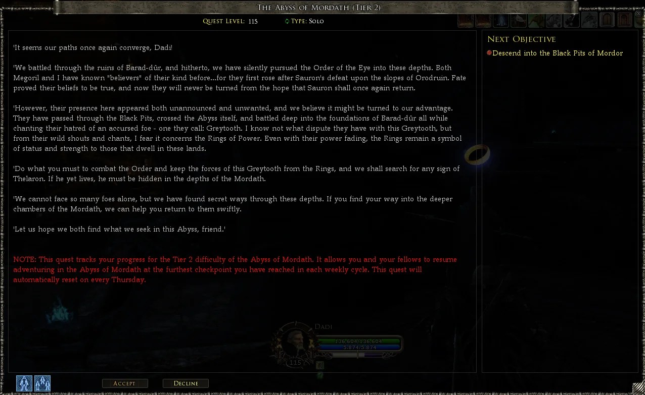 | Продолжая историю, начатую в Дор Амарте, мы спускаемся в Бездну Мордата вслед за Королем Серозубом и его верными Огнегорнами. Пришло время остановить его безумную затею и отомстить ему за беды, что он причинил народу Дарина. Хотя, столкнуться придется не только с ними, но и с продолжателями дела Саурона. Ну и конечно с древним злом, которое там обитает.Вход можно найти на нижних уровнях Барад-Дура (47.2S, 26.1E). Или, если вы уже прошли цепочку квестов в Дор Амарте, можно использовать Фонтан Отражений (48.3S, 8.8E) и пройти "Instance: Into the Abyss", чтобы попасть туда быстрее. Карта прилагается. Поговорите с NPC на входе - он даст вот этот квест: