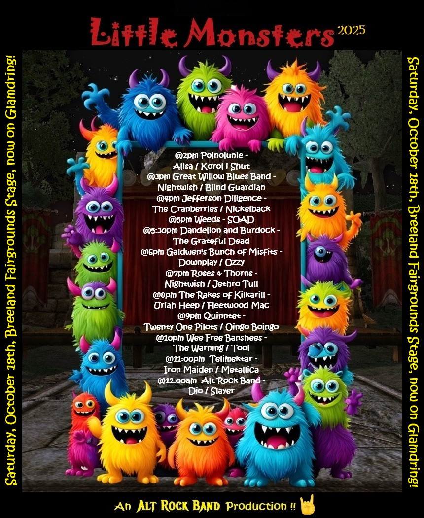 "Полнолуние" приглашает на наше первое гастрольное выступление в этом году - на фестивале Little Monsters на сервере Гламдринг, где каждый участник представляет песни выбранной реальной группы, мы сыграем два получасовых сета с песнями групп "Алиса" и "Король и Шут"!